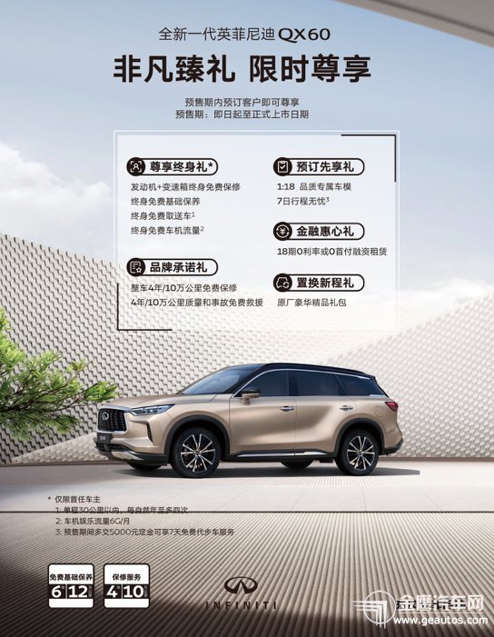 豪華新境界 全新服務(wù)體驗展現(xiàn)人本關(guān)懷 在全民消費升級的當(dāng)下,升級的不止是消費者對于產(chǎn)品的期待,更是對于美好生活的無限向往,這恰好契合了英菲尼迪獨特的品牌理念。預(yù)售品鑒會上,長沙三喜英菲尼迪銷售總監(jiān)鄒立,為到店客戶公布了誠意滿滿的預(yù)售政策。  英菲尼迪篤信,至臻豪華的服務(wù)體驗,是用戶感受“現(xiàn)代東方豪華”的重要方式。因此,全新一代英菲尼迪QX60預(yù)售重磅推出誠意十足的五大“非凡臻禮”,合力為時代先鋒開辟前所未有的豪華出行世界。 即日起至正式上市日期期間,預(yù)訂客戶將尊享五大“非凡臻禮”的周至服務(wù)。
