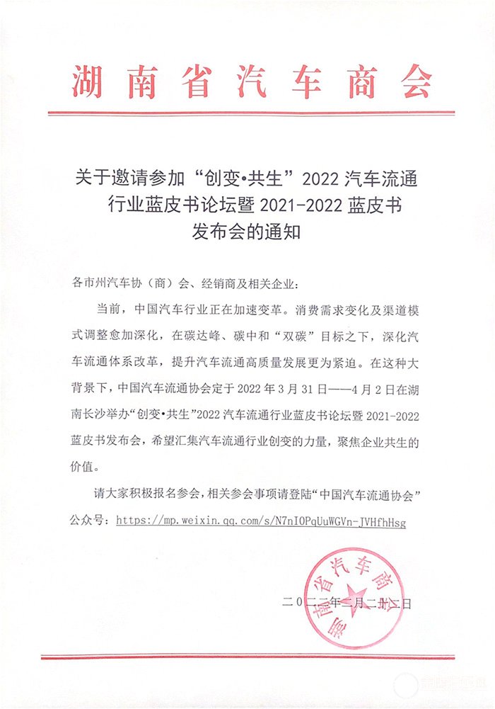當(dāng)前,中國(guó)汽車行業(yè)正在加速變革。消費(fèi)需求變化及渠道模式調(diào)整愈加深化,在碳達(dá)峰、碳中和“雙碳”目標(biāo)之下,深化汽車流通體系改革,提升汽車流通高質(zhì)量發(fā)展更為緊迫。在這種大背景下,中國(guó)汽車流通協(xié)會(huì)定于2022年3月31日——4月2日在湖南長(zhǎng)沙舉辦“創(chuàng)變·共生”2022汽車流通行業(yè)藍(lán)皮書論壇暨2021-2022藍(lán)皮書發(fā)布會(huì),希望匯集汽車流通行業(yè)創(chuàng)變的力量,聚焦企業(yè)共生的價(jià)值。