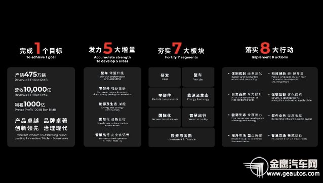 【馮興亞發(fā)布“萬(wàn)億廣汽1578發(fā)展綱要”】 “1”代表1個(gè)目標(biāo),到2030年,廣汽集團(tuán)要實(shí)現(xiàn)產(chǎn)銷(xiāo)超475萬(wàn)輛、營(yíng)收1萬(wàn)億、利稅1千億,成為產(chǎn)品卓越、品牌卓著、創(chuàng)新領(lǐng)先、治理現(xiàn)代的世界一流科技企業(yè);“5”代表發(fā)力5大增量,包括整車(chē)轉(zhuǎn)型升極、零部件強(qiáng)鏈延鏈、能源及生態(tài)賦能、國(guó)際化勇毅前行、智慧出行商業(yè)化運(yùn)營(yíng);“7”代表夯實(shí)7大板塊,包括研發(fā)、整車(chē)、零部件、能源及生態(tài)、國(guó)際化、智慧出行、投資與金融;“8”代表落實(shí)8大行動(dòng),要:著力深化體制機(jī)制改革、科技創(chuàng)新研-投并重、自主品牌全力提升、強(qiáng)鏈延鏈優(yōu)化結(jié)構(gòu)、能源生態(tài)全面發(fā)力、軟件業(yè)務(wù)深度布局、海外市場(chǎng)重點(diǎn)突破、智慧交通模式創(chuàng)新。 馮興亞表示,能源生態(tài)布局是萬(wàn)億廣汽藍(lán)圖新的重要增長(zhǎng)點(diǎn)。未來(lái),廣汽集團(tuán)將在能源及能源生態(tài)領(lǐng)域加大投入,建立“鋰礦+基礎(chǔ)鋰電原料生產(chǎn)+儲(chǔ)能與動(dòng)力電池生產(chǎn)+充換電+儲(chǔ)能”縱向一體化的新能源產(chǎn)業(yè)鏈布局,進(jìn)一步完善動(dòng)力電池上下游產(chǎn)業(yè)鏈布局,降低產(chǎn)業(yè)鏈成本,實(shí)現(xiàn)新能源產(chǎn)業(yè)鏈整體自主可控,同時(shí)協(xié)同發(fā)展儲(chǔ)能業(yè)務(wù),提高廣汽產(chǎn)業(yè)鏈核心競(jìng)爭(zhēng)力。  【馮興亞介紹萬(wàn)億廣汽藍(lán)圖新的重要增長(zhǎng)點(diǎn)】 為助力萬(wàn)億廣汽藍(lán)圖實(shí)現(xiàn),廣汽集團(tuán)旗下自主板塊也發(fā)布了各自的舉措。張帆表示,廣汽研究院將堅(jiān)持以科技驅(qū)動(dòng)創(chuàng)新,引領(lǐng)行業(yè)技術(shù)浪潮,實(shí)現(xiàn)總體研發(fā)實(shí)力達(dá)到行業(yè)領(lǐng)先。在平臺(tái)化方面將開(kāi)發(fā)出廣汽第三代整車(chē)架構(gòu),智聯(lián)化方面將構(gòu)建覆蓋智能汽車(chē)全生命周期的產(chǎn)品服務(wù)體系,實(shí)現(xiàn)商業(yè)模式的創(chuàng)新,電氣化方面將初步實(shí)現(xiàn)多種靈活燃料動(dòng)力產(chǎn)品量產(chǎn)。張躍賽表示,廣汽傳祺也積極擁抱新變革,謀求新發(fā)展,堅(jiān)定“電氣化+智能化”雙核戰(zhàn)略,加速向新能源科技公司轉(zhuǎn)型。首款搭載星靈電子電氣架構(gòu)的傳祺車(chē)將于2023年正式亮相。古惠南則表示,廣汽埃安每年將推出不少于2款全新車(chē)型,同時(shí)加速啟動(dòng)國(guó)際化戰(zhàn)略,成為世界一流高端智能電動(dòng)車(chē)品牌,力爭(zhēng)2030年銷(xiāo)量突破150萬(wàn)輛。  【張帆介紹研發(fā)領(lǐng)域落實(shí)萬(wàn)億廣汽的最新技術(shù)布局】