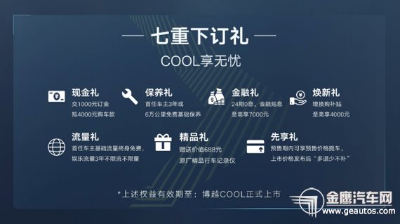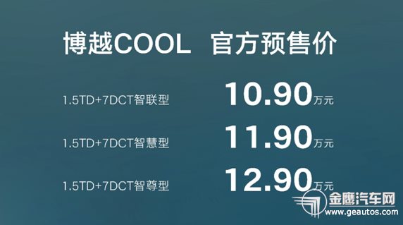 4月7日,博越COOL預(yù)售正式開啟。新車共推出三款車型,其中智聯(lián)型預(yù)售價10.9萬元,智慧型預(yù)售價11.9萬元,智尊型預(yù)售價12.9萬元。目前,博越COOL實車已經(jīng)到店,用戶可預(yù)約前往試駕、訂購。  除了預(yù)售價格非常具有吸引力之外,吉利汽車還為預(yù)售期內(nèi)訂車的用戶準備了七重驚喜大禮: ? 現(xiàn)金禮:交1000元訂金抵4000元購車款 ? 保養(yǎng)禮:首任車主3年或6萬公里免費基礎(chǔ)保養(yǎng) ? 金融禮:24期0息,金融貼息至高享7000元 ? 煥新禮:增換購補貼,至高享4000元補貼 ? 流量禮:首任車主基礎(chǔ)流量終身免費,娛樂流量3年不限流不限量 ? 精品禮:贈送價值688元原廠精品行車記錄儀 ? 先享禮:預(yù)售期內(nèi)可享預(yù)售價格提車,上市價格發(fā)布后“多退少不補”  作為博越家族全新智能SUV,博越COOL智能、駕控、外觀和空間配置上都遠超同級,以全面進階的實力,滿足年輕一代對智能座駕的想象。 個性時尚的外觀設(shè)計是博越COOL的一大亮點,新車打造了全新“數(shù)字棱角”美學(xué),凸顯科技化、年輕化氣息。車頭的棱角擴散格柵配合數(shù)字極光LED前貫穿燈,帶來強烈的視覺沖擊力,結(jié)合尾部超長的數(shù)字霓虹LED貫穿尾燈,帶來獨特辨識度。新車配備數(shù)字燈語功能,可迎賓、可歡送,還有同級獨有的可進化數(shù)字交互燈光秀,儀式感和專屬感拉滿。  在駕控方面,博越COOL搭載同級獨有GEEA 2.0可進化電子電氣架構(gòu),集成動力、駕控、車控、娛樂四大控制域,讓整車功能無限擴展,常開常新。全新一代吉利勁擎1.5TD四缸直噴發(fā)動機,匹配98%超高傳動效率7DCT濕式雙離合變速器,最大輸出功率133kW,最大扭矩290N·m,百公里加速最快7.9s,動力強勁同時更兼顧燃油經(jīng)濟性,百公里油耗(WLTC)僅6.29L,日常通勤毫無負擔。中配即搭載L2級智能駕駛輔助系統(tǒng),行車更舒適、更省心、更安全。  智能是博越家族最鮮明的標簽。博越COOL全系標配高通驍龍8155車機芯片,采用7nm級制程工藝和八核CPU架構(gòu),流暢度和應(yīng)用擴展能力均處于行業(yè)頂尖水平。同級獨有的銀河OS Air智能車機系統(tǒng),最大限度發(fā)揮硬件性能,為新車帶來更強的語音控制以及豐富的應(yīng)用生態(tài)。配合同級獨有的10.25英寸全液晶儀表和13.2英寸2K級數(shù)字中控大屏,能打造全場景的人車交互體驗,智能體驗更絲滑、更高效。  從第一款博越上市至今,7年來博越家族已贏得超過150萬用戶的信賴,成為名副其實的全球經(jīng)典車型。未來,在“好看、好開、好智能”三好優(yōu)勢上全面煥新的博越COOL,將以越級的產(chǎn)品力參與市場競爭,與博越L形成新的家族矩陣,夯實并擴大吉利汽車在SUV市場的地位與影響力。
