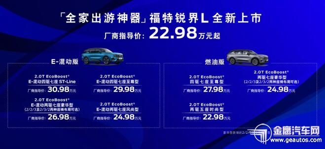 4月29日,大7座混動LSUV福特銳界L于2023湖南車展上正式上市,燃油版廠商指導(dǎo)價22.98萬元-27.98萬元,E-混動版廠商指導(dǎo)價24.98萬元-30.98萬元,更精準(zhǔn)地滿足家庭用戶的細分需求。銳界L全面進化,憑借5米車長+近3米軸距,2/2/3座椅布局+二排雙懸浮式頭等艙座椅,大馬力E-混動系統(tǒng)+機械真四驅(qū),SYNC+2.0人機交互+L2級智能駕駛,打造全家出游神器,以一車勝多車的產(chǎn)品實力,成為無私人充電樁家庭大7座SUV的更優(yōu)選。