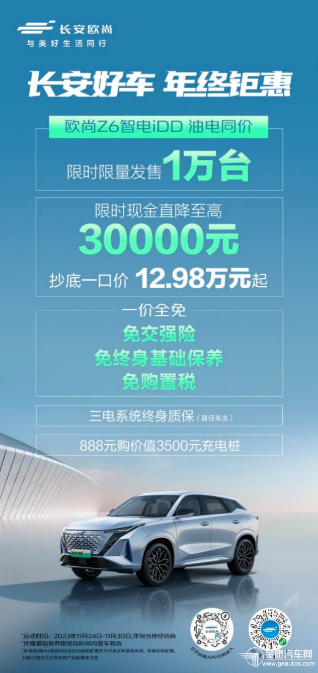 年終盛典,火力全開!長安汽車力爭自主品牌銷冠王,再發(fā)大招!11月24日-11月30日,長安歐尚長沙陽光100店推出「長安好車 年終鉅惠」促銷活動,誠意奉獻廣大消費者,更有王牌產品現(xiàn)金直降和驚喜福利大放送,鉅惠享不停!  長安歐尚車系官方直降,至高優(yōu)惠30000元,正是購車好時機! 據(jù)長安汽車內部消息透露,此次「長安好車 年終鉅惠」促銷活動,長安歐尚主流熱門車系集結,以超驚喜價格直降優(yōu)惠,強勢拉低購車門檻。 其中,長安歐尚Z6智電iDD車系,現(xiàn)金至高直降30000元,現(xiàn)價12.98萬元起(原市場指導價15.58萬元起);長安歐尚Z6車系,現(xiàn)金至高直降15000元,現(xiàn)價8.99萬元起(原市場指導價9.99萬元起);長安歐尚X5 PLUS車系,現(xiàn)金至高直降20000元,現(xiàn)價7.19萬元起(原市場指導價8.89萬元起)。 遍看車市各大自主汽車品牌,長安汽車率先推出年終購車鉅惠,主流熱門車系現(xiàn)金直降,可以說是本年度給到消費者的最后一波價格福利。毫不夸張地說,這絕對是廣大長安汽車粉絲的最好買車好時機! 當然,想要力爭自主汽車品牌年度銷冠,長安汽車帶來的驚喜遠遠不止官方現(xiàn)金直降這么簡單。與此同時,針對品牌主流熱門車系,長安還推出了超有吸引力的金融和保養(yǎng)政策,給廣大消費者奉送一站式鉅惠購車體驗。 “智能座艙天花板”,長安歐尚Z6/智電iDD定義智感出行!  11月24日-11月30日,凡購買長安歐尚Z6智電iDD車型,即可享受三電系統(tǒng)終身質保(首任車主)和888元購價值3500元充電樁優(yōu)惠政策,限時限量發(fā)售1萬臺。