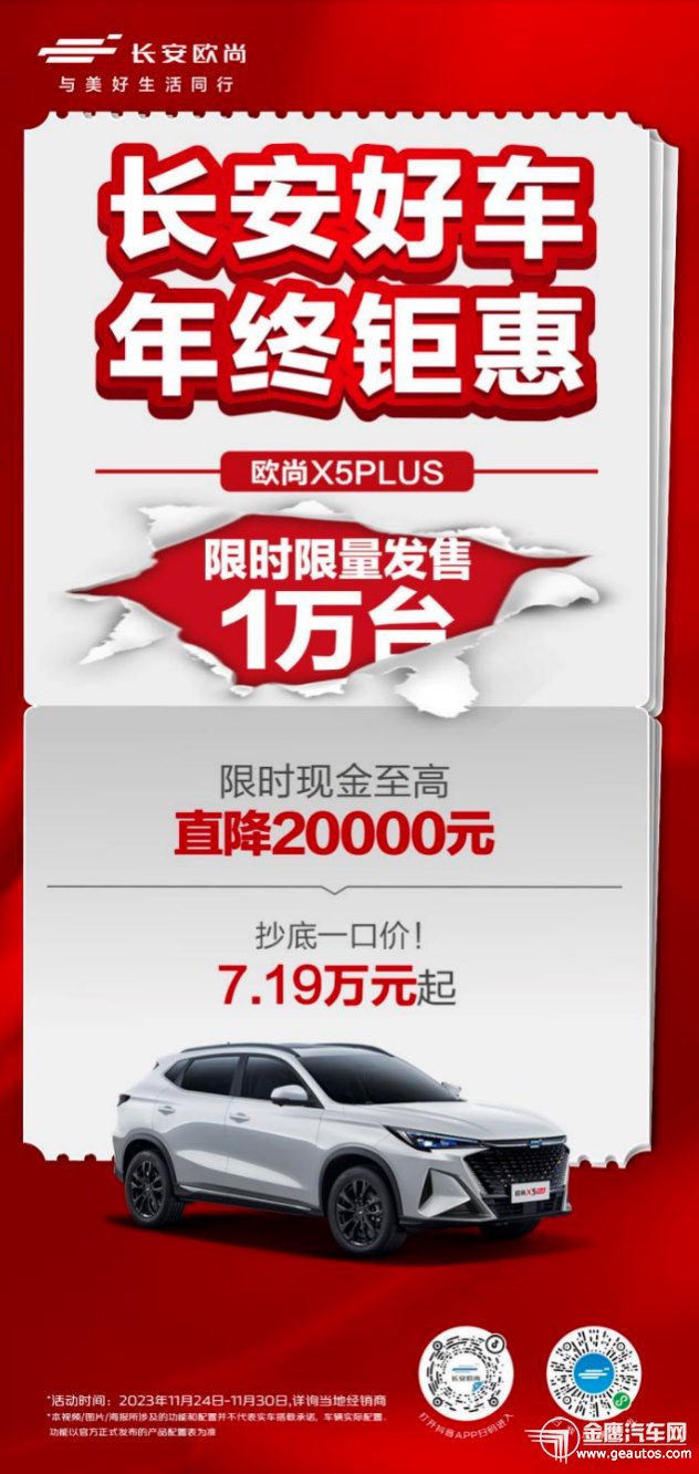 與此同時,購買長安歐尚Z6車型,抄底一口價,驚喜不斷惠不停,限時限量發(fā)售1萬臺。 科技繁榮時代,當選“SUV智能天花板”!長安歐尚Z6智電iDD和長安歐尚Z6,都搭載了OnStyle 5.1智慧快樂座艙,以“一大首發(fā)和四大領先”智能化配置,共同打造未來快樂出行體驗。駕控品質上,“12萬級新能源SUV實力擔當”長安歐尚Z6智電iDD擁有同級最大電池包,純電續(xù)航里程150KM、滿油滿電綜合續(xù)航1200KM,駕控體驗領跑同級;連續(xù)5個月銷量破萬的長安歐尚Z6,搭載藍鯨新一代NE 1.5T發(fā)動機+7DCT濕式雙離合變速箱、藍鯨新一代NE 2.0T發(fā)動機+愛信8速手自一體變速器兩套動力組成,助力用戶盡享澎湃駕感。 “年輕人的第一臺智趣SUV”,選長安歐尚X5 PLUS就GO了!  強勢感恩回饋,價格一降到底。11月24日-11月30日,購買長安歐尚X5 PLUS車型,享鯨爆抄底價以及更多驚喜優(yōu)惠,限時限量發(fā)售1萬臺。 作為“年輕人的第一臺智趣SUV”,長安歐尚X5 PLUS以高價值標準為用戶打磨出高質量的產品體驗。該車搭載OnStyle5.1智慧快樂座艙-年輕特別版,帶領年輕用戶開啟智趣出行生活;動力進階,該車具備藍鯨新一代NE 1.5T發(fā)動機+藍鯨7速濕式雙離合變速器黃金動力組合,起步、超車和后程加速上均快人一步,帶來更具質價比的潮趣用車體驗。 作為自主汽車品牌的第一梯隊,長安汽車火力全開,誓奪自主品牌銷冠王!回顧2023年,從1月-10月,長安汽車累計銷量達到211萬輛,同比增長10.7%。其中,集團自主品牌表現(xiàn)愈發(fā)強勢,2023年累計銷量高達174.7萬輛,同比增長15.9%。 冠軍品質成就高度自信,今年4月,長安汽車推出了“海納百川”計劃,該計劃旨在通過5~6年時間整體推進出海戰(zhàn)略,全面鋪進海外各市場產品布局。目前,長安已累計進入全球63個市場,在海外已建成450家銷售渠道。未來,長安汽車還將加快布局歐洲、美洲、中東及非洲、亞太、獨聯(lián)體六大區(qū)域,進入90%以上的全球市場。 與此同時,與長安汽車“海納百川”同步推進的,還有新能源“香格里拉”和智能化“北斗天樞”,共同組成長安汽車三大戰(zhàn)略。步步為營,穩(wěn)扎穩(wěn)打。今后,長安汽車還將持續(xù)提升智能智造實力,加速電動化轉型步伐,促成全面領先的出行生態(tài),力爭從中國走向全球,打造世界一流汽車品牌。 「長安好車 年終鉅惠」活動,正在火熱進行中。如果你正好有購車打算,11月24日-11月30日,歡迎前往當?shù)亻L安歐尚長沙陽光100店咨詢購買,買好車選長安,開啟智慧舒享的出行生活!