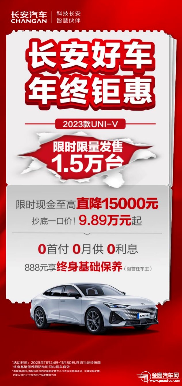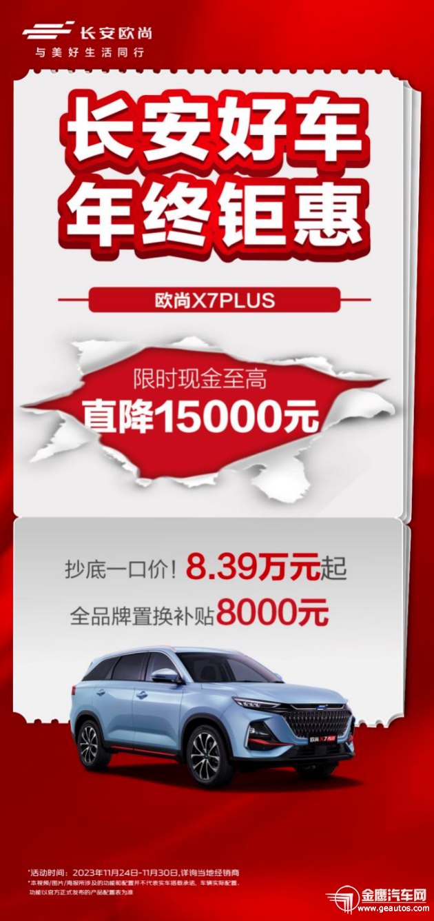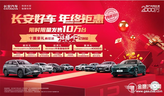 其中,長安第三代CS75 PLUS車系,現(xiàn)金直降15000元,抄底一口價10.99萬元起(原市場指導價11.79萬起);2023款 UNI-V車系,現(xiàn)金至高直降15000,抄底一口價9.89萬元起(原市場指導價11.69萬元起);長安歐尚Z6智電iDD車系,現(xiàn)金至高直降30000元,抄底一口價12.98萬元起(原市場指導價15.58萬元起);長安歐尚Z6車系,現(xiàn)金至高直降15000元,抄底一口價8.99萬元起(原市場指導價9.99萬元起);長安歐尚X5 PLUS車系,現(xiàn)金至高直降20000元,抄底一口價7.19萬元起(原市場指導價8.89萬元起)。 遍看車市各大自主汽車品牌,長安汽車率先推出年終購車鉅惠,五大熱門車系現(xiàn)金直降,可以說是本年度給到消費者的最后一波價格福利。毫不夸張地說,這絕對是廣大長安汽車粉絲的最好買車時機! 當然,想要力爭自主汽車品牌年度銷冠,長安汽車帶來的驚喜遠遠不止官方現(xiàn)金直降這么簡單。與此同時,針對品牌五大熱門車系,長安還推出了超有吸引力的金融和保養(yǎng)政策,給廣大消費者奉送一站式鉅惠購車體驗。 爆款「中國SUV銷冠王」,買長安第三代CS75 PLUS福利盡享! 11月23日-11月30日,凡購買長安第三代CS75 PLUS車型,即可享受0首付 0月供 0利息和888元享終身基礎(chǔ)保養(yǎng)優(yōu)惠政策,限時限量發(fā)售2萬臺。 作為2023年度中國質(zhì)量協(xié)會中國汽車用戶滿意指數(shù)(CACSI)“10萬-15萬緊湊型SUV市場用戶滿意度第一”的車型,長安第三代CS75 PLUS自上市以來,就以超高配置,燃油車緊湊級SUV銷冠的硬核實力一騎絕塵,藍鯨新一代NE1.5T和2.0T發(fā)動機+同級唯一全系愛信8速手自一體變速器動力組合,強悍性能秒殺一眾品牌車型。 “地表潮流轎跑”2023款 UNI-V讀懂年輕期待!  活動期間,凡購買2023款 UNI-V車型,即可享受0首付 0月供 0利息和888元享終身基礎(chǔ)保養(yǎng)優(yōu)惠政策,限時限量發(fā)售1.5萬臺。 身為長安旗下的年輕化和個性化座駕擔當,2023款 UNI-V采用家族性感·未來美學設計語言,賦能科技美感;搭載未來智慧座艙,閃耀年輕活力;更有藍鯨新一代NE 1.5T發(fā)動機+7DCT濕式雙離合變速箱、藍鯨新一代NE 2.0T發(fā)動機+愛信8速手自一體變速器兩種動力選擇,點燃駕馭激情。 “智能座艙天花板”,長安歐尚Z6/智電iDD定義智感出行!  11月23日-11月30日,凡購買長安歐尚Z6智電iDD車型,即可享受免交強險+免終身基礎(chǔ)保養(yǎng)+免購置稅、三電系統(tǒng)終身質(zhì)保(首任車主)和888元購價值3500元充電樁優(yōu)惠政策,限時限量發(fā)售1萬臺。 與此同時,購買長安歐尚Z6車型,即可享受全品牌置換補貼4000元和5-9萬零低利息貸款等多種金融支持方案。 科技繁榮時代,當選“SUV智能天花板”!長安歐尚Z6智電iDD和長安歐尚Z6,都搭載了OnStyle 5.1智慧快樂座艙,以“一大首發(fā)和四大領(lǐng)先”智能化配置,共同打造未來快樂出行體驗。駕控品質(zhì)上,“12萬級新能源SUV實力擔當”長安歐尚Z6智電iDD擁有同級領(lǐng)先電池包,純電續(xù)航里程150KM、滿油滿電綜合續(xù)航1200KM,駕控體驗領(lǐng)跑同級;連續(xù)5個月銷量破萬的長安歐尚Z6,搭載藍鯨新一代NE 1.5T發(fā)動機+7DCT濕式雙離合變速箱、藍鯨新一代NE 2.0T發(fā)動機+愛信8速手自一體變速器兩套動力組成,助力用戶盡享澎湃駕感。 “年輕人的第一臺智趣SUV”,選長安歐尚X5 PLUS就GO了!  強勢感恩回饋,價格一降到底。11月23日-11月30日,購買長安歐尚X5 PLUS車型,享“鯨爆”抄底價以及更多驚喜優(yōu)惠,限時限量發(fā)售1萬臺。 作為“年輕人的第一臺智趣SUV”,長安歐尚X5 PLUS以高價值標準為用戶打磨出高質(zhì)量的產(chǎn)品體驗。該車搭載OnStyle5.1智慧快樂座艙-年輕特別版,帶領(lǐng)年輕用戶開啟智趣出行生活;動力進階,該車具備藍鯨新一代NE 1.5T發(fā)動機+藍鯨7速濕式雙離合變速器黃金動力組合,起步、超車和后程加速上均快人一步,帶來更具質(zhì)價比的潮趣用車體驗。 作為自主汽車品牌的第一梯隊,長安汽車火力全開,誓奪自主品牌銷冠王!回顧2023年,從1月-10月,長安汽車累計銷量達到211萬輛,同比增長10.7%。其中,集團自主品牌表現(xiàn)愈發(fā)強勢,2023年累計銷量高達174.7萬輛,同比增長15.9%。 冠軍品質(zhì)成就高度自信,今年4月,長安汽車推出了“海納百川”計劃,該計劃旨在通過5~6年時間整體推進出海戰(zhàn)略,全面鋪進海外各市場產(chǎn)品布局。目前,長安已累計進入全球63個市場,在海外已建成450家銷售渠道。未來,長安汽車還將加快布局歐洲、美洲、中東及非洲、亞太、獨聯(lián)體五大區(qū)域,進入90%以上的全球市場。 與此同時,與長安汽車“海納百川”同步推進的,還有新能源“香格里拉”和智能化“北斗天樞”,共同組成長安汽車三大戰(zhàn)略。步步為營,穩(wěn)扎穩(wěn)打。今后,長安汽車還將持續(xù)提升智能智造實力,加速電動化轉(zhuǎn)型步伐,促成全面領(lǐng)先的出行生態(tài),力爭從中國走向全球,打造世界一流汽車品牌。 「長安好車 年終鉅惠」活動,正在火熱進行中。如果你正好有購車打算,11月23日-11月30日,歡迎前往當?shù)亻L安汽車相關(guān)4S店咨詢購買,買好車選長安,開啟智慧舒享的出行生活!
