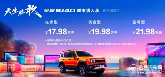 “五敢”秀出“潮玩”實(shí)力,全新BJ40城市獵人版上市即成焦點(diǎn) 全新BJ40定位世家級(jí)潮野SUV,將分為“城市獵人”和“刀鋒英雄”兩個(gè)版型先后上市,本次上市的“城市獵人版”,以“天生姓敢”為傳播口號(hào),一語雙關(guān),諧音“性感”,無論是車,還是駕馭它的人,都天生擁有一眼入魂,讓人著迷的氣質(zhì),也表達(dá)了人車共有的“敢”的精神內(nèi)核。對(duì)于這樣一款極具個(gè)性的產(chǎn)品,也可以用“天生姓敢”一詞來總結(jié)新車亮點(diǎn)。 首先是敢不從眾的外觀造型。全新BJ40城市獵人版將新時(shí)代的潮流元素,融入到北京汽車一脈相承的“情感硬核”設(shè)計(jì)語言中,大膽創(chuàng)新,形成了該車特色獨(dú)具的“味道”。比如用硬派SUV中獨(dú)有的無框車門演繹時(shí)尚動(dòng)感,用自信挺拔的車身、硬朗的線條傳遞堅(jiān)毅的精神氣質(zhì),用“五闕星環(huán)”前臉為家族式DNA增加新注解,及至環(huán)繞式格柵燈、旗幟飛揚(yáng)尾燈、車側(cè)獨(dú)特的“D”形框,無處不體現(xiàn)著一種“潮”然不群的潮流態(tài)度。  其次是敢為人先的智能配置。全新BJ40城市獵人版在豐富的智能配置加持下,視覺感與體驗(yàn)感全都拉滿。越野首創(chuàng)五聯(lián)屏智能座艙、高通驍龍8155 旗艦芯片、全車27個(gè)智能傳感器+趣行智駕系統(tǒng)實(shí)現(xiàn)L2.5級(jí)智駕輔助,50米尋跡倒車、自動(dòng)泊車/遙控泊車也都一應(yīng)俱全。  再次是敢于改變的舒適升級(jí)。豪華真皮包裹、12向電調(diào)、功能齊全的主駕座椅,零重力姿態(tài)、一鍵小憩的女王副駕,同級(jí)領(lǐng)先的靜謐體驗(yàn),以及大面積軟包內(nèi)飾、256色氛圍燈、可開啟全景天窗、智能新風(fēng)系統(tǒng),讓全新BJ40城市獵人版的高品質(zhì)體驗(yàn)無處不在。  之后是敢不一樣的硬派血脈。傳承“越野世家”基因,實(shí)力自然過硬。全新BJ40城市獵人版采用兩縱八橫一體式大梁,并將關(guān)鍵部分材料進(jìn)行了升級(jí),使用戶能夠更從容面對(duì)惡劣路況。在通過性方面,230mm最小離地間隙、37°接近角、35°離去角、27°縱向通過角,涉水深度750mm,硬核實(shí)力遠(yuǎn)超同級(jí),加上自研ATS等多項(xiàng)越野黑科技,讓潮玩體驗(yàn)更加極致,更加專業(yè),更加痛快。  最后是敢于擔(dān)當(dāng)?shù)陌踩刈o(hù)。全新BJ40出色的安全性,是用戶勇于挑戰(zhàn)、探索更多精彩的堅(jiān)實(shí)保障。全新BJ40城市獵人版著重對(duì)車身結(jié)構(gòu)和剛性進(jìn)行了升級(jí),得益于無疆越野技術(shù)平臺(tái)賦能,采用了國內(nèi)獨(dú)創(chuàng)的內(nèi)置防滾架安全車身,應(yīng)用國內(nèi)領(lǐng)先的軍工級(jí)液壓脹型全隱藏式設(shè)計(jì),配合車身采用的高于1350MPa屈服強(qiáng)度、大于1500 MPa抗拉強(qiáng)度的高強(qiáng)鋼,使整個(gè)車身形成一個(gè)“堅(jiān)固堡壘”,最大限度保障駕乘人員安全,讓潮玩,更安心。  “煥新元年”構(gòu)建生態(tài),廣邀伙伴賦能潮玩生活 2023年11月17日廣州車展北京汽車用戶生態(tài)品牌也通過“迷你劇”中潮星們的演繹,呈現(xiàn)在公眾面前。對(duì)北京汽車而言,2023無疑是全方位重塑品牌的“煥新元年”,繼上海、成都相繼發(fā)布品牌煥新戰(zhàn)略,推出全新技術(shù)品牌后,廣州車展打造全新用戶生態(tài)品牌,將是完成全年煥新的最后一步。