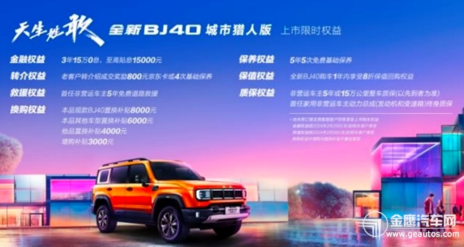 2023年11月25日,北京汽車旗下重磅新品——全新BJ40城市獵人版在常德歡樂城正式上市,共推出三個(gè)車型配置,上市價(jià)格均比預(yù)售期直降6000元,分別為先鋒型17.98萬、俠客型19.98萬、至尊型21.98萬。  同時(shí),更有“7大上市限時(shí)權(quán)益”放送,分別是: 金融權(quán)益:3年15萬0息,最高貼息15000元; 轉(zhuǎn)介權(quán)益:老客戶轉(zhuǎn)介紹成交獎(jiǎng)勵(lì)800元京東卡或4次基礎(chǔ)保養(yǎng) 救援權(quán)益:首任非運(yùn)營車主5年免費(fèi)道路救援 換購權(quán)益:本品現(xiàn)款BJ40車型8000元置換補(bǔ)貼、本品其他車型6000元置換補(bǔ)貼、他品車型4000元置換補(bǔ)貼、3000元增購補(bǔ)貼 保養(yǎng)權(quán)益:5年5次免費(fèi)基礎(chǔ)保養(yǎng) 保值權(quán)益:全新BJ40購車1年內(nèi)享受8折保值回購權(quán)益 質(zhì)保權(quán)益:非營運(yùn)車主5年或15萬公里整車質(zhì)保(以先到者為準(zhǔn)),首任家用非營運(yùn)車主動(dòng)力總成(發(fā)動(dòng)機(jī)和變速箱)終身質(zhì)保  另外,搶先預(yù)訂期及預(yù)售期客戶同等享受上市購車權(quán)益,金融權(quán)益限2024年2月29日(含)前購車用戶享受,保值權(quán)益限2024年2月9日(含)前購車客戶享受,換購權(quán)益中增購與置換補(bǔ)貼不疊加享受。 本次新車發(fā)布會(huì),后續(xù)可添加本地亮點(diǎn)環(huán)節(jié)介紹(北京汽車聯(lián)動(dòng)開心麻花X開心即興,打造了一出爆笑“迷你劇”,更有全新BJ40品牌摯友杜海濤傾力助陣,在博得眾多觀眾眼球的同時(shí),還將作為發(fā)布“主角”的全新BJ40產(chǎn)品賣點(diǎn)和用戶生態(tài)品牌內(nèi)容融入劇情,迎來了一波話題高潮。)