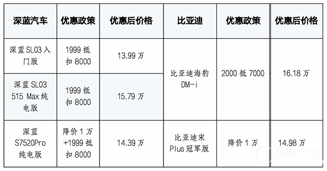 自十一月以來,各家廠商紛紛推出了各種促銷政策繼續(xù)以價換量,深藍汽車雖然不是最早開始的,但或許具誠意。以深藍SL03的同級車型來看,比亞海豹DM-i目前享2000元抵7000元的優(yōu)惠政策,優(yōu)惠后價格為16.18萬元,而優(yōu)惠后的深藍SL03,入門版售價僅為13.99萬元,515 Max純電版售價也僅為15.79萬元,相較于比亞迪海豹,深藍SL03的性價比優(yōu)勢更加明顯;而與深藍S7同級的比亞迪宋Plus 冠軍版 雖然也是降價一萬的優(yōu)惠政策,但優(yōu)惠后售價依然是14.98萬元,對比深藍S7優(yōu)惠后的14.39萬元起,價格還是略高。