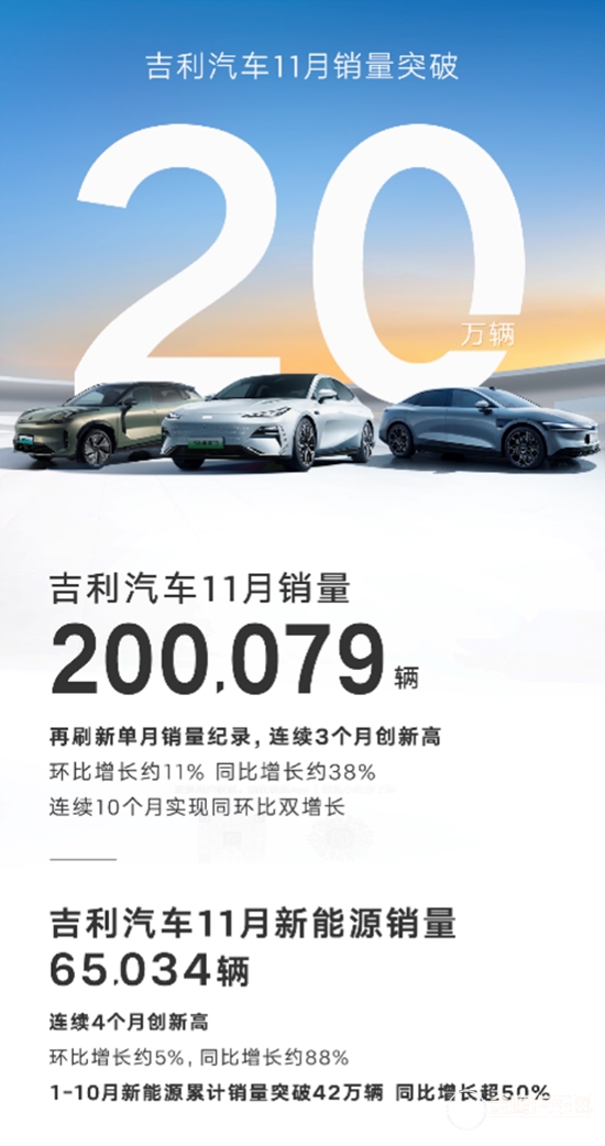 12月1日,吉利汽車控股有限公司(0175.HK)公布最新銷量數(shù)據(jù):11月乘用車銷量200079輛,同比增長約38%,環(huán)比增長約11%,單月銷量突破20萬大關(guān),連續(xù)3個月創(chuàng)歷史新高、并已連續(xù)10個月保持同比、環(huán)比雙增長。
