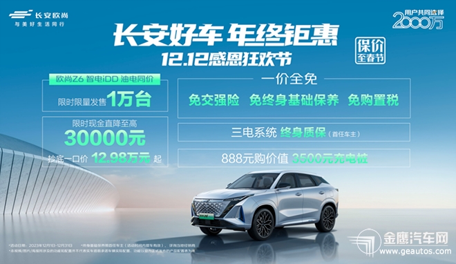 無憂智慧出行方案,長安歐尚Z6/智電iDD解鎖舒享新體驗(yàn)! 活動(dòng)期間,凡購買長安歐尚Z6智電iDD車型,即可享受免交強(qiáng)險(xiǎn)+免終身基礎(chǔ)保養(yǎng)+免購置稅、三電系統(tǒng)終身質(zhì)保(首任車主)和888元購價(jià)值3500元充電樁優(yōu)惠政策,限時(shí)限量發(fā)售 1 萬臺(tái)。超級(jí)續(xù)航,超颯駕感,非你莫屬!