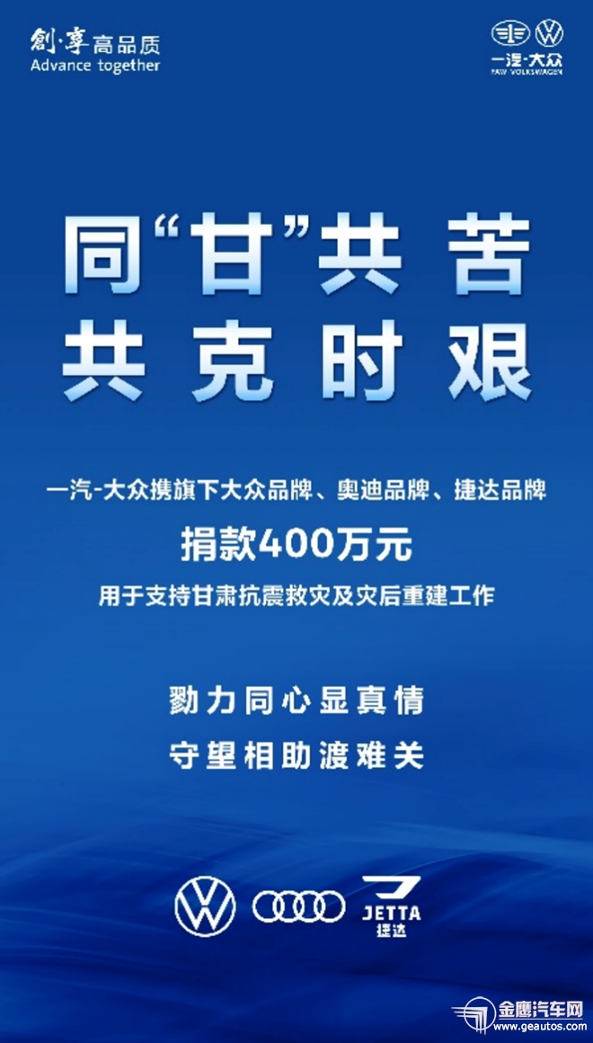 近日,甘肅臨夏州積石山縣發(fā)生6.2級地震。時值寒冬,災(zāi)情牽動著全國人民的心。12月22日,一汽-大眾攜旗下大眾品牌、奧迪品牌、捷達品牌,向災(zāi)區(qū)捐款400萬元,用于支持甘肅抗震救災(zāi)及災(zāi)后重建工作。  抗震救災(zāi),你我同行。一汽-大眾三大品牌快速響應(yīng),積極行動,推出多項暖心專屬服務(wù),包括免費道路救援,免費車輛檢車,維修綠色通道等。免費救援服務(wù)熱線7×24小時隨時待命,為有需要的客戶提供緊急救援和服務(wù)。大眾品牌道路救援服務(wù)熱線:4008-171-888、奧迪品牌道路救援服務(wù)熱線:4008-171-666、捷達品牌道路救援服務(wù)熱線:4008-171-111。 災(zāi)難無情,人間有愛。一汽-大眾將繼續(xù)關(guān)注災(zāi)后救援進展,與災(zāi)區(qū)人民守望相助,共渡難關(guān)。