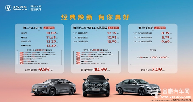 3月20日,以“經典煥新·有你真好”為主題的長安汽車春季煥新發(fā)布會盛大召開。發(fā)布會上,長安汽車第三代CS75PLUS冠軍版、第二代UNI-V、第三代逸動三款新車正式上市。其中第三代CS75PLUS冠軍版發(fā)布3款車型,售價12.19萬元-13.99萬元;第二代UNI-V發(fā)布4款車型,售價10.89萬元-12.49萬元; 第三代逸動發(fā)布3款車型,售價8.39萬元-9.69萬元。