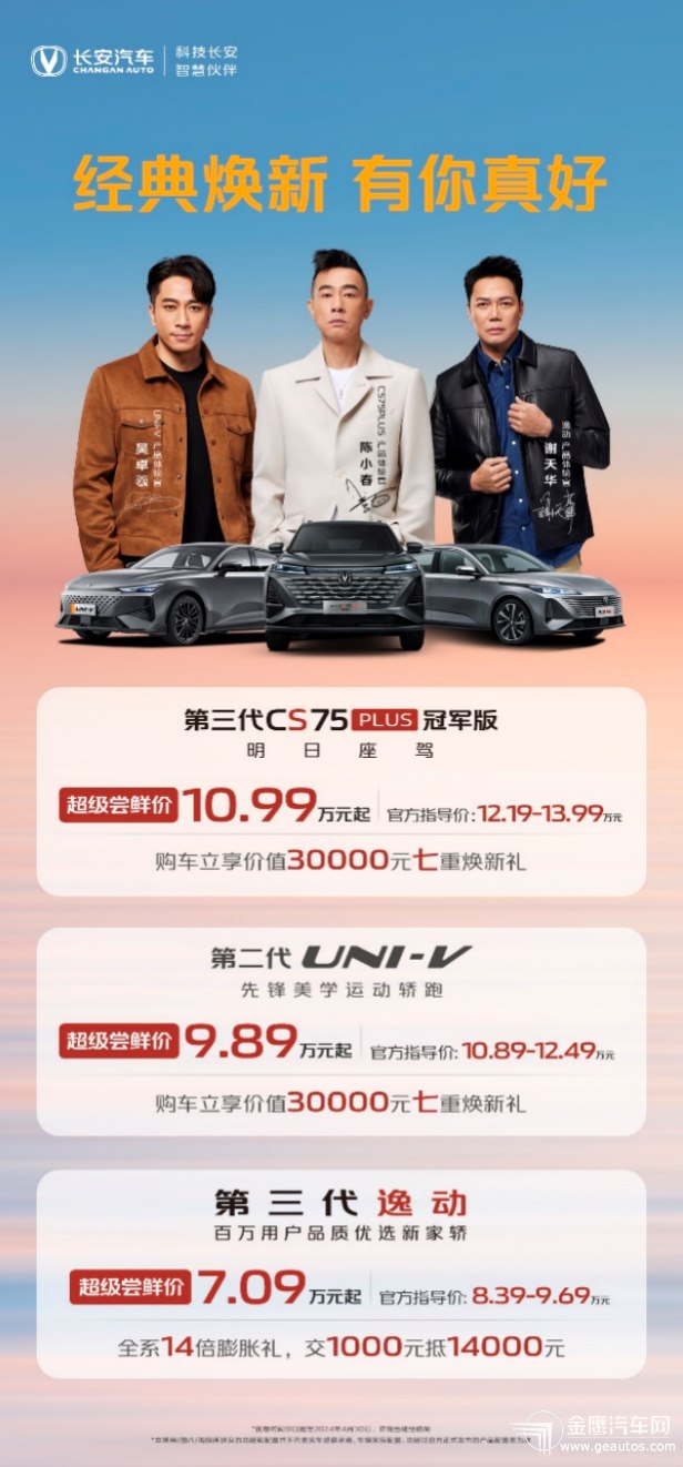 同時,為了助力更多消費者輕松煥新,長安汽車還為三車用戶準備了多重大禮。即日起至4月30日,第三代CS75PLUS冠軍版以及第二代UNI-V的用戶,購車即可立享至高30000元七重煥新禮!第三代逸動用戶購車,即可享交1000元抵14000元的全系14倍膨脹禮,以7.09萬元起的超級嘗鮮價,將“百萬用戶品質優(yōu)選新家轎”開回家! 立足長安造車40周年歷史節(jié)點,三大經典煥新而來 2024年,是長安汽車邁入民用汽車領域的第四十個年頭,這40年,是中國汽車工業(yè)從無到有,由大變強的40年,也是中國品牌汽車從0開始走進千家萬戶的40年。而40年造車征程的深厚積累,也讓長安汽車由中國汽車工業(yè)發(fā)展的建設者,成長為了中國汽車品牌的典型代表。 從1984年首批車輛出廠開啟中國微車時代,到2021年成為首個產銷突破2000萬輛的中國汽車品牌;從“長安之星”1999年起連續(xù)八年蟬聯微車銷售冠軍,到2023年包括長安CS75系列、UNI-V、逸動系列在內的多款車型分別登頂SUV、轎跑、家轎等各個細分市場年度銷量冠軍……“買車看榜單,好車選長安!” 40年來,長安汽車用一款又一款長盛不衰的經典產品,不斷引領華系車向上突破,并以2500萬用戶的認可和信賴,成為華系崛起的支柱品牌。 而此次上市的三款經典煥新車型,立足長安汽車40年造車的歷史底蘊而來,在長安汽車領先技術和品質成果的賦能下,為用戶帶來全新的高品質汽車生活體驗。 第三代CS75PLUS冠軍版,明日座駕,進階而來 今年1—2月,長安CS75系列以5.9萬輛市場表現依舊牢牢占據中國品牌SUV燃油車銷量榜首。從2014年首款車型上市后37個月銷量突破50萬輛大關,到2023年以24.48萬輛的年銷數據強勢登頂年度SUV燃油車銷量冠軍,擁有超過200萬用戶基礎的長安CS75系列,已憑借領先的產品持續(xù)十年領跑中國SUV市場。 此次上市的第三代CS75PLUS冠軍版,全面繼承家族冠軍基因,不僅外觀內飾升級煥新,智能、動力、安全也迎來全面進化,為廣大用戶帶來超乎期待、舒適安心的明日出行體驗。