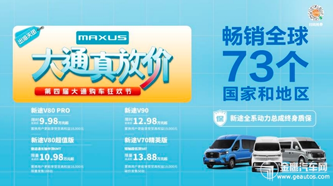 大通盛惠,購(gòu)車(chē)狂歡,寵粉的最好方式是“把價(jià)格打下來(lái)”!10月28日,上汽大通MAXUS第四屆購(gòu)車(chē)狂歡節(jié)火熱開(kāi)幕,品牌全品系“大放價(jià)”,全天線上直播開(kāi)啟全民購(gòu)車(chē)狂歡,歡迎進(jìn)入上汽大通MAXUS直播間!輕客“新途”和新能源輕型車(chē)“大拿”、“星際”皮卡、“領(lǐng)地”SUV、“大家”和G系MPV、“生活家”“旅行家”和“探索家”系列房車(chē)等全家族明星車(chē)系通通“上鏈接”,“小黃車(chē)”全品類福利拉滿,千元購(gòu)車(chē)抵用券放送不停,“拼手速”即可解鎖限時(shí)限量的限定驚喜!已連續(xù)多年舉辦的上汽大通MAXUS購(gòu)車(chē)狂歡節(jié),早已成為品牌和用戶之間的一場(chǎng)雙向奔赴,上汽大通MAXUS以全矩陣產(chǎn)品陣容和全維度優(yōu)惠福利,全方位滿足用戶購(gòu)車(chē)需求。  【上汽大通MAXUS第四屆購(gòu)車(chē)狂歡節(jié)】 “中國(guó)輕客第一品牌”不玩虛的,“新途”“大拿”雙強(qiáng)攜手“真放價(jià)” 買(mǎi)輕客,選大通新途,奔赴新征途!作為“中國(guó)輕客第一品牌”,上汽大通MAXUS輕客“新途”和新能源輕型車(chē)“大拿”在這場(chǎng)購(gòu)車(chē)狂歡、直播盛宴上搶先釋放誠(chéng)意鉅惠!新途V80 PRO攜手新途V90掀起狂歡購(gòu)熱潮,限時(shí)狂歡價(jià)低至9.98萬(wàn)元起和12.98萬(wàn)元起,大通輕客不玩虛的,用戶購(gòu)車(chē)福利超實(shí)在!同時(shí),兩款限量款車(chē)型“史無(wú)前例”限時(shí)發(fā)售——新途V80超值版傲運(yùn)通長(zhǎng)軸中頂6MT(7座)限量冰點(diǎn)價(jià)10.98萬(wàn)元起,新途V70精英版短軸超低頂9AT限量冰點(diǎn)價(jià)13.88萬(wàn)元起,用冰點(diǎn)價(jià)就能買(mǎi)到爆款車(chē),上汽大通堪稱輕客圈“最寵粉”車(chē)企!不僅如此,在誠(chéng)意的價(jià)格之上,置換用戶還能享受至高權(quán)益19000元,“新途”全系均有動(dòng)力總成終身質(zhì)保等,買(mǎi)大通輕客,保值且放心!另外,除了“新途”燃油系列,上汽大通MAXUS新能源輕型車(chē)“大拿”系列同樣給力,大拿V1至高可享28500元綜合優(yōu)惠!億元補(bǔ)貼,通通“拿”捏,福利疊加、層層加碼,上汽大通MAXUS以實(shí)力鑄就信賴,更以誠(chéng)意回饋信賴!  【購(gòu)車(chē)狂歡節(jié)“新途”系列活動(dòng)】  【購(gòu)車(chē)狂歡節(jié)“大拿”系列活動(dòng)】 歷經(jīng)13年市場(chǎng)檢驗(yàn)的新途V80,憑借高銷(xiāo)量、高口碑成為一款當(dāng)之不愧的“國(guó)民輕客”;比同級(jí)“不止高一檔”的新途V90,也憑借越級(jí)產(chǎn)品力引領(lǐng)輕客行業(yè)邁入新紀(jì)元;可滿足通勤、客運(yùn)、出游、商務(wù)、創(chuàng)業(yè)等全場(chǎng)景的跨界輕客新途V70,堪當(dāng)輕客車(chē)主出行“搭子”最優(yōu)選;榮獲Euro NCAP“鉑金級(jí)”最高安全評(píng)級(jí)、成就中國(guó)商用車(chē)“獨(dú)一份”的大拿V1,更樹(shù)立了“中國(guó)造”輕客安全新高度……深耕輕客行業(yè)近十四年,上汽大通MAXUS輕客家族的“大樹(shù)”枝繁葉茂、碩果累累。越級(jí)產(chǎn)品力、全球統(tǒng)一高品質(zhì)以及此次的超值購(gòu)車(chē)福利,讓上汽大通MAXUS輕客成為同級(jí)“質(zhì)價(jià)比之王”,“輕朋客友”們敬請(qǐng)鎖定上汽大通MAXUS官方直播間輕客專場(chǎng)直播! “高端皮卡領(lǐng)軍品牌”福利來(lái)襲,“星際”皮卡全系可享三重壕禮 追尋“星辰大!薄霸(shī)和遠(yuǎn)方”,“星際”皮卡伴用戶開(kāi)啟探索人生!在這場(chǎng)購(gòu)車(chē)狂歡派對(duì)上,包含星際L、星際R、星際H在內(nèi)的“星際”全系車(chē)型,為皮卡車(chē)迷帶來(lái)五年超低息貸款金融禮、至高20000元置換補(bǔ)貼禮、價(jià)值9999元?jiǎng)恿偝山K身質(zhì)保禮三重福利,讓夢(mèng)想座駕觸手可及,輕松啟程!特價(jià)直播盛宴,優(yōu)惠不停歇,皮卡專場(chǎng)直播間還限量釋放星際L精英版8折特價(jià)名額,極限拼手速,買(mǎi)到即賺到!  【購(gòu)車(chē)狂歡節(jié)“星際”系列活動(dòng)】 “時(shí)尚品質(zhì)皮卡”星際L、“國(guó)際全能皮卡”星際R和“科技性能皮卡”星際H,既陪伴著眾多皮卡車(chē)迷探索世界、征服每一個(gè)目的地,更持續(xù)引領(lǐng)中國(guó)皮卡向高端化、智能化、高質(zhì)量方向升級(jí)進(jìn)階。在國(guó)內(nèi),上汽大通MAXUS已成為“高端皮卡領(lǐng)軍品牌”,同時(shí)在海外也布下“為全球用戶提供全尺寸、全動(dòng)力、全場(chǎng)景皮卡產(chǎn)品”的大局,目前大通皮卡海外累計(jì)銷(xiāo)量已突破18萬(wàn)輛,其中歐洲、澳新、美洲等皮卡發(fā)達(dá)市場(chǎng)銷(xiāo)量占比超90%,逐漸成為“全球發(fā)達(dá)國(guó)家首選中國(guó)皮卡”。 全球五星MPV+硬派越野SUV乘用車(chē)家族齊上陣,限時(shí)返場(chǎng)+限量秒殺,速搶!手慢無(wú)! 黃金十年間,于用戶,上汽大通MAXUS G10陪著無(wú)數(shù)車(chē)主經(jīng)歷風(fēng)風(fēng)雨雨,成為許多人心中最可靠的伙伴;于行業(yè),其更開(kāi)路自主MPV領(lǐng)域、創(chuàng)下百萬(wàn)公里無(wú)大修、鍛造有口皆碑的“國(guó)賓車(chē)”品質(zhì)。如今,“全新一代G10”已于不久前上市發(fā)布。值此購(gòu)車(chē)狂歡節(jié)之際,全新一代G10系列上市豪禮也迎來(lái)重磅限時(shí)返場(chǎng)
