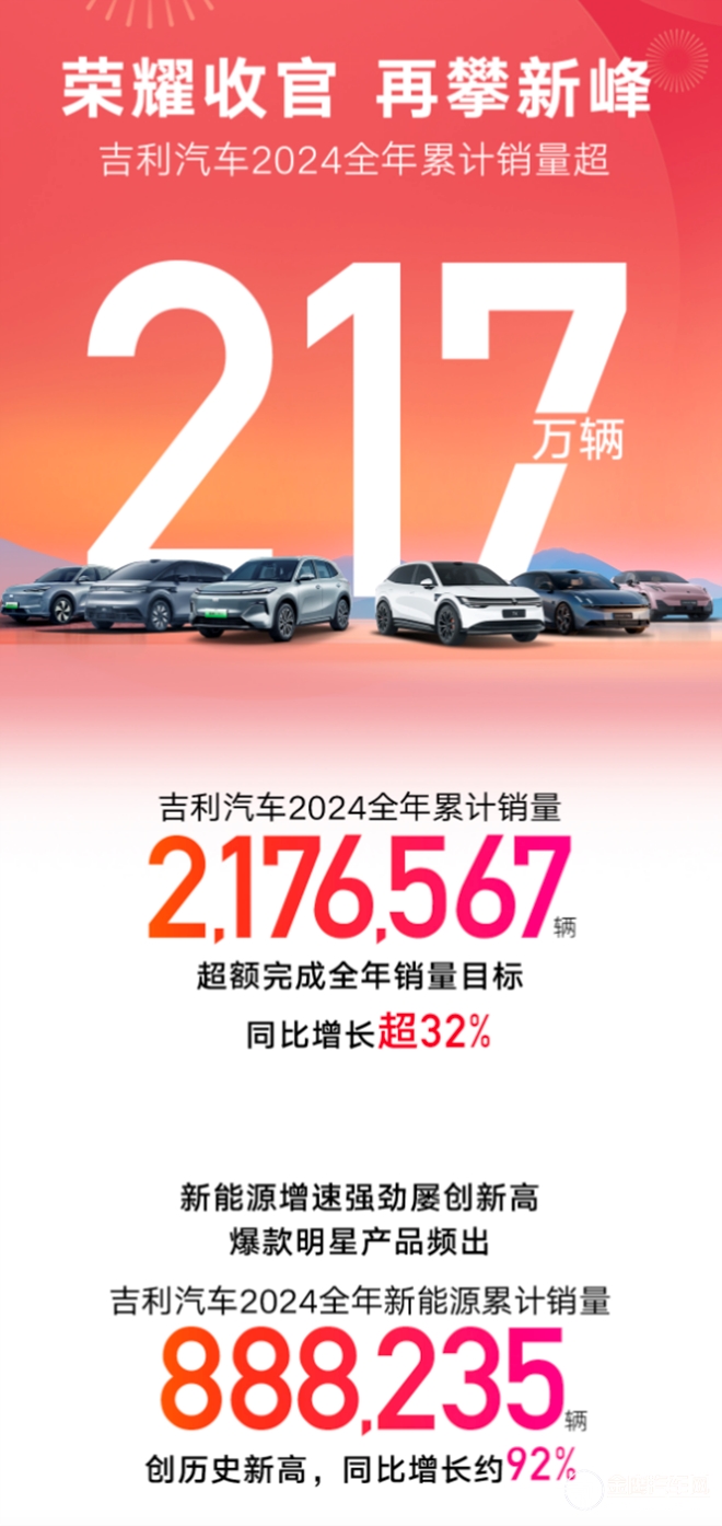 1月5日,吉利汽車集團(tuán)CEO淦家閱就2025年271萬輛的銷量目標(biāo),進(jìn)行了全面解析。淦家閱表示,在新產(chǎn)品及技術(shù)創(chuàng)新、海外出口、能源多樣化等方面,吉利汽車集團(tuán)今年都將加速推進(jìn)。其中,吉利銀河今年將推出5款全新產(chǎn)品,全年銷量將挑戰(zhàn)100萬輛。  堅定做新能源精品車的引領(lǐng)者,吉利銀河劍指百萬銷量 2024年,“智能吉利2025”戰(zhàn)略布局迎來了技術(shù)產(chǎn)出期,“一網(wǎng)三體系”的成效開始顯現(xiàn)。GEA架構(gòu)、神盾短刀電池、11合1智能電驅(qū)、雷神EM-i超級電混等行業(yè)領(lǐng)先的智能新能源技術(shù)全面上車應(yīng)用,助力銀河E5、吉利星愿、銀河星艦7等新產(chǎn)品均成為各自細(xì)分市場的爆款。銀河E5上市20天交付過萬,星愿上市16天交付過萬,星艦7 上市13天交付過萬……交付速度不斷被刷新。2024年,銀河全年累計銷量突破了49萬輛,同比增長80%,遠(yuǎn)高于行業(yè)平均34.5%的增長。