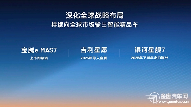 2025年,吉利銀河將推出5款全新產(chǎn)品,全面進(jìn)入主流新能源市場,完善產(chǎn)品矩陣。其中包括2款SUV、3款轎車,每一款都是主流細(xì)分市場的核心產(chǎn)品,都將實現(xiàn)上市即上量。同時,吉利銀河將在架構(gòu)技術(shù)、智能汽車全域AI、智能駕駛等方面持續(xù)創(chuàng)新,堅定做新能源精品車的引領(lǐng)者,挑戰(zhàn)年銷百萬的目標(biāo)。  淦家閱透露,吉利將在1月7日的 CES國際消費電子展上,向全球展示吉利AI科技在用戶端、研發(fā)端以及生態(tài)端的全面布局與應(yīng)用。在AI科技的賦能下,吉利的AI數(shù)字底盤、AI銀河精靈、雷神EM-i超級電混、Flyme Auto智能座艙以及高價值智駕技術(shù),將在最新產(chǎn)品上廣泛搭載。吉利,將成為智能汽車AI科技的普及者。  在智能駕駛方面,吉利將圍繞核心場景+底層技術(shù)+明星產(chǎn)品,實現(xiàn)新的突破。吉利將導(dǎo)入全新算力平臺,加快全面實現(xiàn)無圖化部署,讓主流新能源產(chǎn)品也能實現(xiàn)高階智駕體驗的平權(quán)。 2025年,吉利還將推出搭載雷神EM-i超級電混的全新轎車,將電混轎車的虧電油耗全面帶入2L時代。備受用戶好評的Flyme Auto座艙系統(tǒng),將推出交互體驗更好、生態(tài)應(yīng)用更豐富的2.0版本。 在燃油車領(lǐng)域,盡管2024年燃油車市場大盤下滑了18%,吉利品牌依然實現(xiàn)了同比13.5%的正增長,逆勢奪得了國內(nèi)中國品牌燃油車銷量冠軍。今年,吉利品牌也布局了全新?lián)Q代的燃油產(chǎn)品,中國星將繼續(xù)發(fā)揮在燃油車領(lǐng)域的領(lǐng)先優(yōu)勢,同時把新能源的智能化優(yōu)勢賦能燃油車,持續(xù)提升產(chǎn)品核心競爭力。  此外,為進(jìn)一步落實《臺州宣言》,持續(xù)推進(jìn)內(nèi)部資源的融合,翼真和雷達(dá)也正式并入吉利汽車集團(tuán)。整合之后,吉利汽車集團(tuán)將實現(xiàn)轎車、SUV、MPV、越野、皮卡等品類的全覆蓋,并致力于將各個品牌都打造成各自細(xì)分市場的品質(zhì)標(biāo)桿。 持續(xù)向全球輸出智能精品車,加快渠道建設(shè)與KD布局 2024年,吉利汽車集團(tuán)持續(xù)發(fā)力海外市場,全年海外出口累計銷量403923輛,同比增長超53%。其中,吉利品牌熱銷全球80多個國家,在沙特阿拉伯、阿聯(lián)酋、哈薩克斯坦、巴拿馬等重點市場推出16款高端主力車型,全球銷售及服務(wù)網(wǎng)點已擴(kuò)展至900家,并新設(shè)4家海外子公司,持續(xù)強(qiáng)化本土化運營能力。  在淦家閱看來,國際市場要有好的表現(xiàn),產(chǎn)品和渠道是核心。通過提升海外市場的產(chǎn)品和渠道的競爭力,吉利今年將在海外市場實現(xiàn)15.6%以上的增長。 吉利品牌將進(jìn)一步深化全球戰(zhàn)略布局,持續(xù)向全球市場輸出智能精品車,構(gòu)建全球體系化競爭優(yōu)勢。以銀河技術(shù)為原型車的e.MAS7,上個月在馬來西亞正式發(fā)布,上市之后迅速獲得了市場認(rèn)可,訂單是競品車型的3-5倍,成為了當(dāng)?shù)氐谋钴囆。今年,銀河新能源車還將陸續(xù)登錄澳新、泛歐、東南亞、拉美等地區(qū)的20余個國家。繼e.MAS7之后,吉利星愿也將導(dǎo)入寶騰。銀河星艦7也將在下半年出口海外市場。  在海外渠道建設(shè)方面,吉利今年將增加300多個銷售及服務(wù)網(wǎng)點,預(yù)計到年底全球渠道網(wǎng)點將超越1100家,進(jìn)一步提升吉利的渠道覆蓋和售后保障能力。同時,吉利也加速推進(jìn)KD制造布局,在印尼、越南、中亞、非洲等多個國家推進(jìn)KD本地化制造,有效提高全鏈成本競爭力。 可醇可油可電,吉利將量產(chǎn)全球首款超醇混動汽車 綠色甲醇,被吉利視為跨越油氣時代的最佳解決方案,是能夠將清潔可再生能源與汽車出行進(jìn)行最佳匹配的發(fā)展路徑之一。吉利在甲醇汽車領(lǐng)域已經(jīng)耕耘了20年,成功解決了腐蝕、溶脹,耐久和冷啟動四大難題,掌握了甲醇汽車的核心技術(shù),擁有標(biāo)準(zhǔn)和專利300項,銷售甲醇運營車輛近4萬臺,累計行駛里程超200億公里,實現(xiàn)甲醇汽車從小批量試點運行到大規(guī)模推廣應(yīng)用的跨越。  今年,吉利甲醇汽車的目標(biāo)將不再局限在B端運營。四季度,吉利將面對C端用戶推出第五代可醇、可電、可油的超醇電混產(chǎn)品,轎車和SUV雙車齊發(fā)。  據(jù)了解,第五代超醇電混技術(shù)可實現(xiàn)甲醇和汽油兩種燃料在同一油箱內(nèi)的靈活配比,采用了全球首創(chuàng)的甲醇發(fā)動機(jī),發(fā)動機(jī)熱效率達(dá)到了全球最高的48.15%,并且突破性地實現(xiàn)甲醇燃料在零下35℃低溫下的啟動。不僅低溫環(huán)境下動力性能強(qiáng)勁,而且補(bǔ)能無憂,同時用車成本也更經(jīng)濟(jì)。  在哈爾濱2025年第九屆亞冬會上,吉利還將提供一支醇?xì)鋭恿Ψ⻊?wù)車隊。目前,首批350輛醇?xì)潆娀炱囈呀?jīng)交付給了組委會,這也是醇?xì)潆娀炱囀状未笠?guī)模服務(wù)國際性體育賽事。  面對2025年存量競爭態(tài)勢更加明顯的汽車市場,吉利堅持守正創(chuàng)新,堅守高質(zhì)量發(fā)展,持續(xù)用代際領(lǐng)先的技術(shù)和高質(zhì)優(yōu)價的產(chǎn)品,滿足消費者的出行需求。淦家閱表示,“吉利將堅定秉承智能精品車路線,從底層技術(shù)出發(fā),繼續(xù)挑戰(zhàn)物理極限,打造高價值的產(chǎn)品,引領(lǐng)新能源汽車邁入品質(zhì)新時代