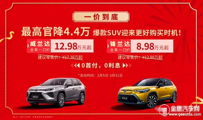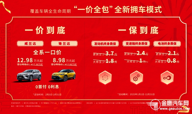 2月5日,蛇年新春開(kāi)工首日,廣汽豐田率先舉行一口價(jià)暨終身質(zhì)保線(xiàn)上發(fā)布會(huì),推出“一價(jià)到底”和“一保到底”購(gòu)車(chē)福利,針對(duì)爆款車(chē)型威蘭達(dá)和鋒蘭達(dá)實(shí)施“一口價(jià)”,廠(chǎng)家指導(dǎo)價(jià)降幅最高達(dá)4.4萬(wàn)元,并提供“三大核心部件終身質(zhì)!睓(quán)益,以史上最大力度的福利全面滿(mǎn)足消費(fèi)者既要價(jià)格低、又要高品質(zhì)、更要高保障的需求,并以?xún)r(jià)格觸底、品質(zhì)保底、大廠(chǎng)兜底的魄力,打響開(kāi)年第一槍?zhuān)?/span>